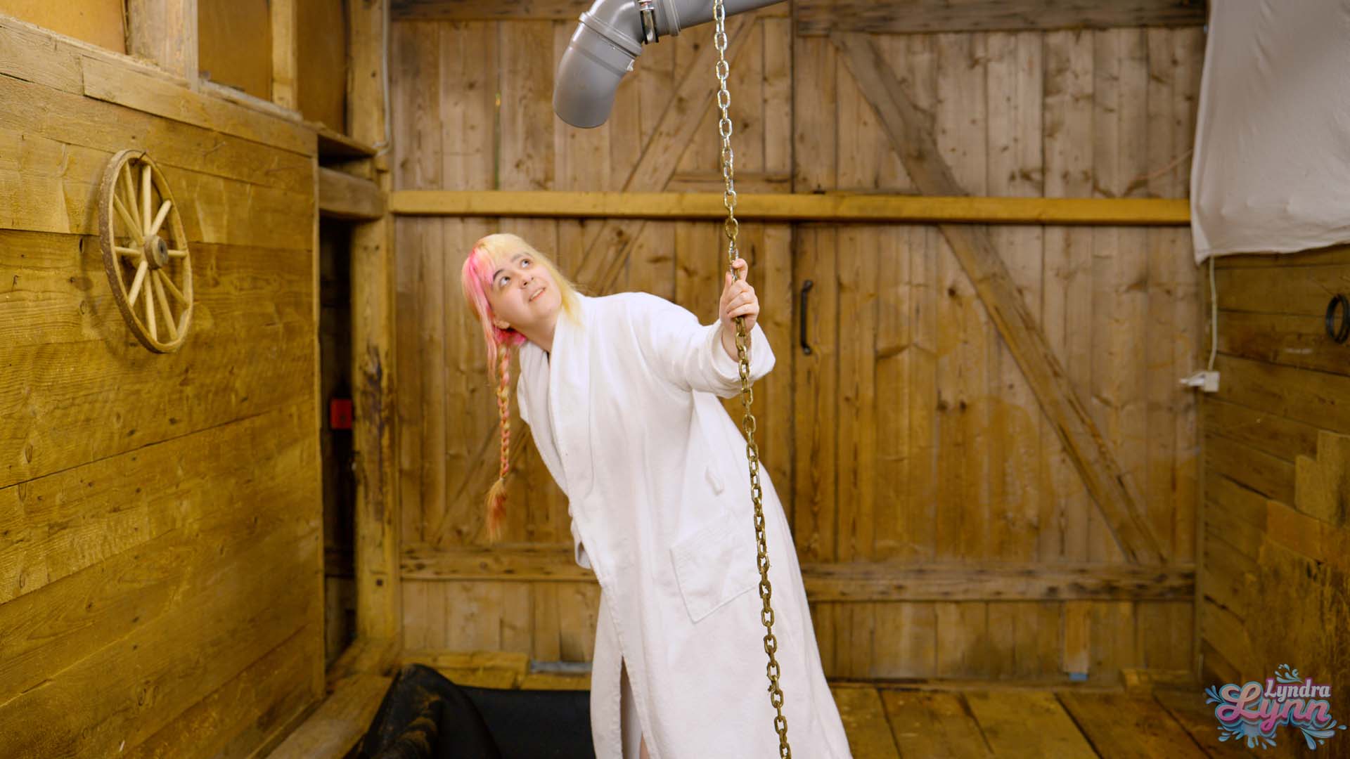 Ich bin zurück im Schuppen für meine zweite Kuhdungdusche. Ich erkunde den Stall erneut und überprüfe die Kette, ob alles in Ordnung ist. Dann ziehe ich daran und das schöne Geräusch des flüssigen Kuhmistes, der durch die Rohre läuft, kehrt zurück. Ich steige unter die Öffnung des Rohrs, sobald ich die ersten großen Kuhfladen sehe, die aus dem Rohr tropfen. Ich genieße diese Art von Duschen wirklich, ich mag es dreckig und stinkend, das macht mich so an. Ich bedecke mich mit dem Mist aus dem Rohr, ich stelle mich direkt darunter, damit ich ihn überall bekomme. Ich öffne mein Höschen, damit es direkt hinein tropfen kann.